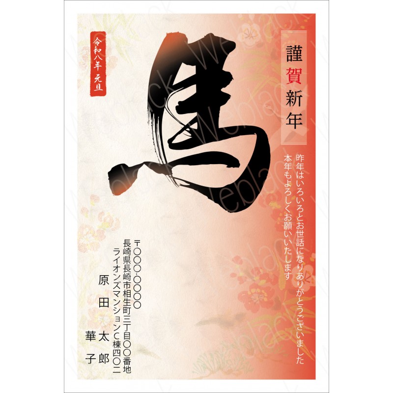 タグ: 和風年賀状, 筆文字風デザイン年賀状, 午年年賀状, 午年デザイン年賀状, 干支文字デザイン年賀状, たてデザイン, 祝詞変更可, 文章変更可, フチあり