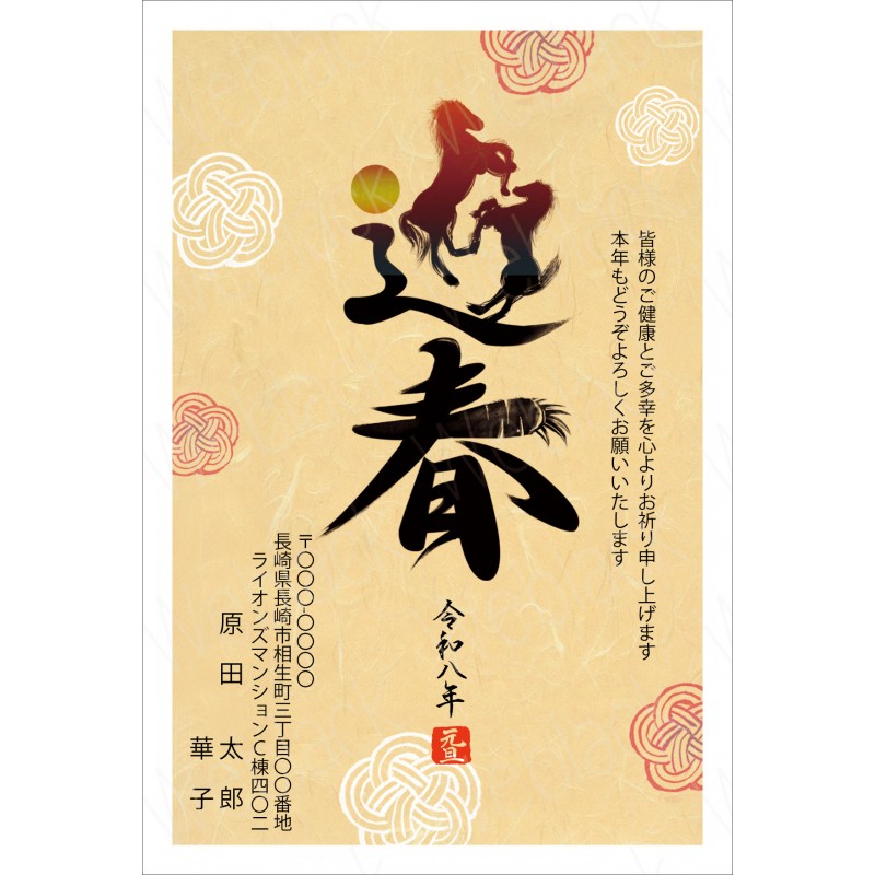 タグ: 和風年賀状, 筆文字風デザイン年賀状, 午年年賀状, 午年デザイン年賀状, 干支文字デザイン年賀状, たてデザイン, 祝詞変更可, 文章変更可, フチあり