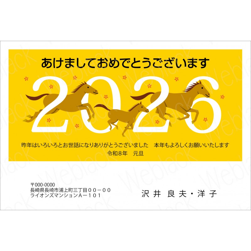 タグ: 和風年賀状, 絵文字風デザイン年賀状, 午年年賀状, 午年デザイン年賀状, 干支文字デザイン年賀状, よこデザイン, 祝詞変更可, 文章変更可, フチあり