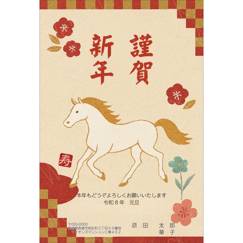 タグ: 和風年賀状, オリジナルデザイン年賀状, 午年年賀状, 午年デザイン年賀状, , たてデザイン, 祝詞変更可, 文章変更可, フチなし