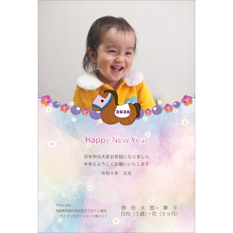 タグ: 写真フレーム年賀状, 午年年賀状, 午年デザイン年賀状, たてデザイン, 祝詞変更可, 文章変更可, フチなし