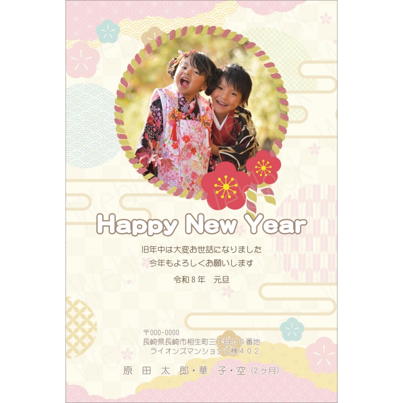 差出人郵便番号・差出人氏名・連名4名まで・旧姓・()書きでのお子様の年齢(お名前下に入ります)・お電話番号を挿入可能です。