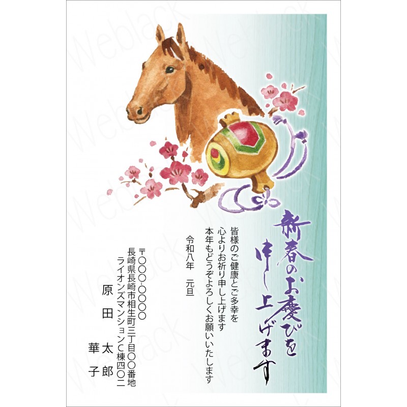 タグ: 和風年賀状, スタンダードデザイン年賀状, 午年年賀状, 午年デザイン年賀状, 干支文字デザイン年賀状, たてデザイン, 祝詞変更可, 文章変更可, フチあり