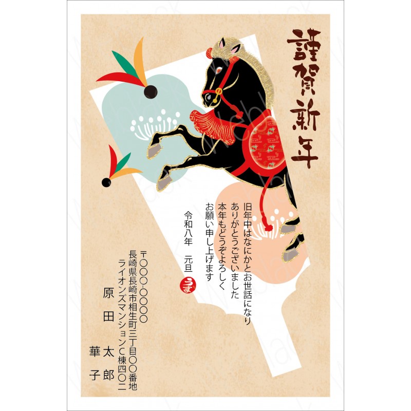 タグ: 和風年賀状, 午年年賀状, 午年デザイン年賀状, 干支文字デザイン年賀状, たてデザイン, 祝詞変更可, 文章変更可, フチあり