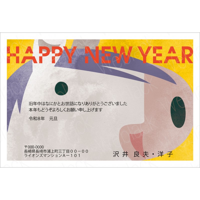 タグ: カジュアルデザイン年賀, 午年年賀状, 午年デザイン年賀状, 干支文字デザイン年賀状, よこデザイン, 祝詞変更可, 文章変更可, フチあり