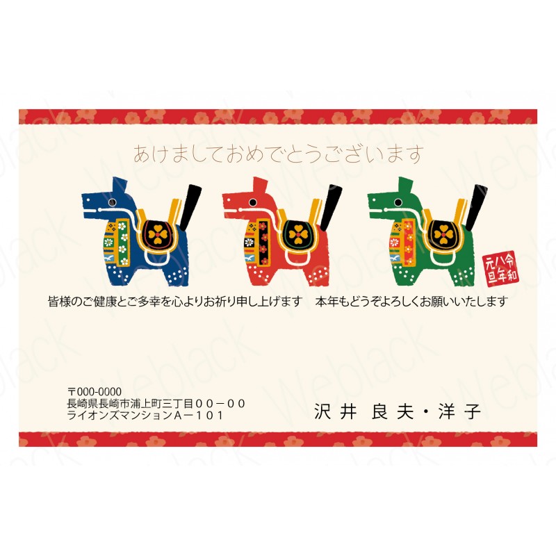 タグ: カジュアルデザイン年賀, 午年年賀状, 午年デザイン年賀状, 干支文字デザイン年賀状, よこデザイン, 祝詞変更可, 文章変更可, フチあり