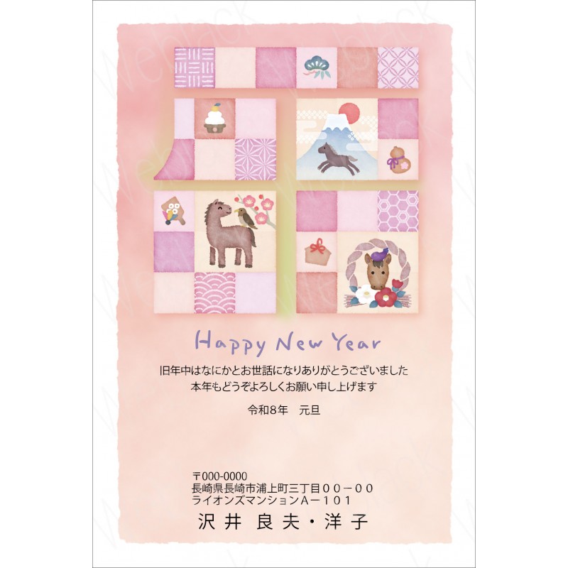 タグ: キュートデザイン年賀状, 午年年賀状, 午年デザイン年賀状, 干支文字デザイン年賀状, たてデザイン, 祝詞変更可, 文章変更可, フチあり