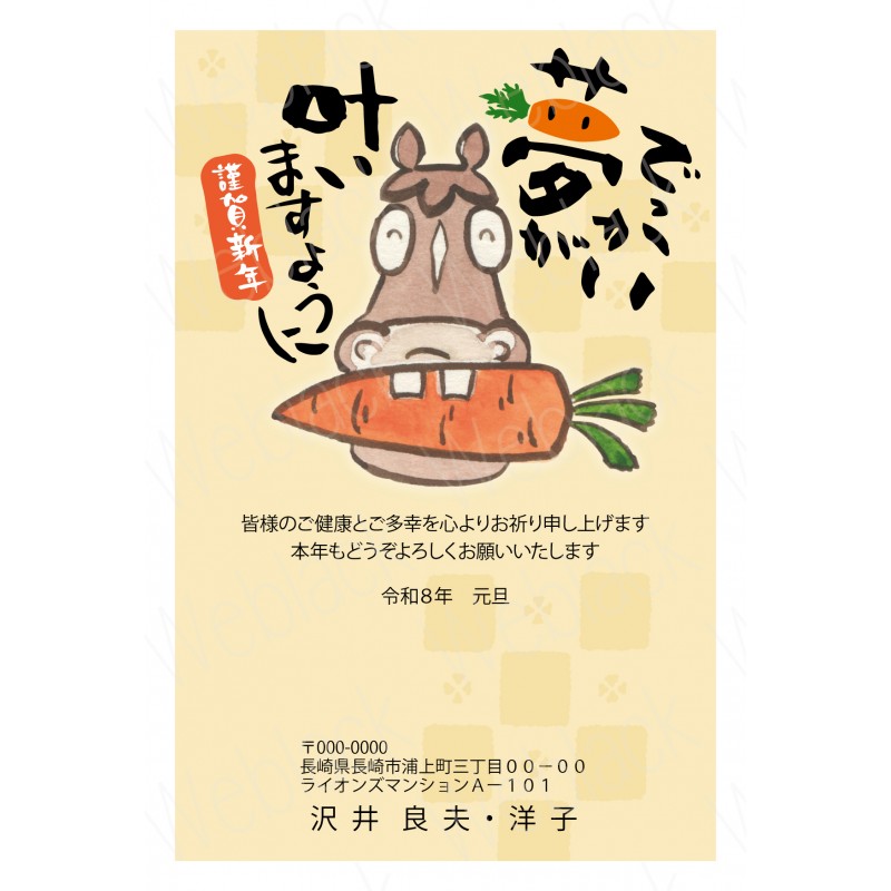 タグ: 和風年賀状, スタンダードデザイン年賀状, 午年年賀状, 午年デザイン年賀状, 干支文字デザイン年賀状, たてデザイン, 祝詞変更可, 文章変更可, フチあり